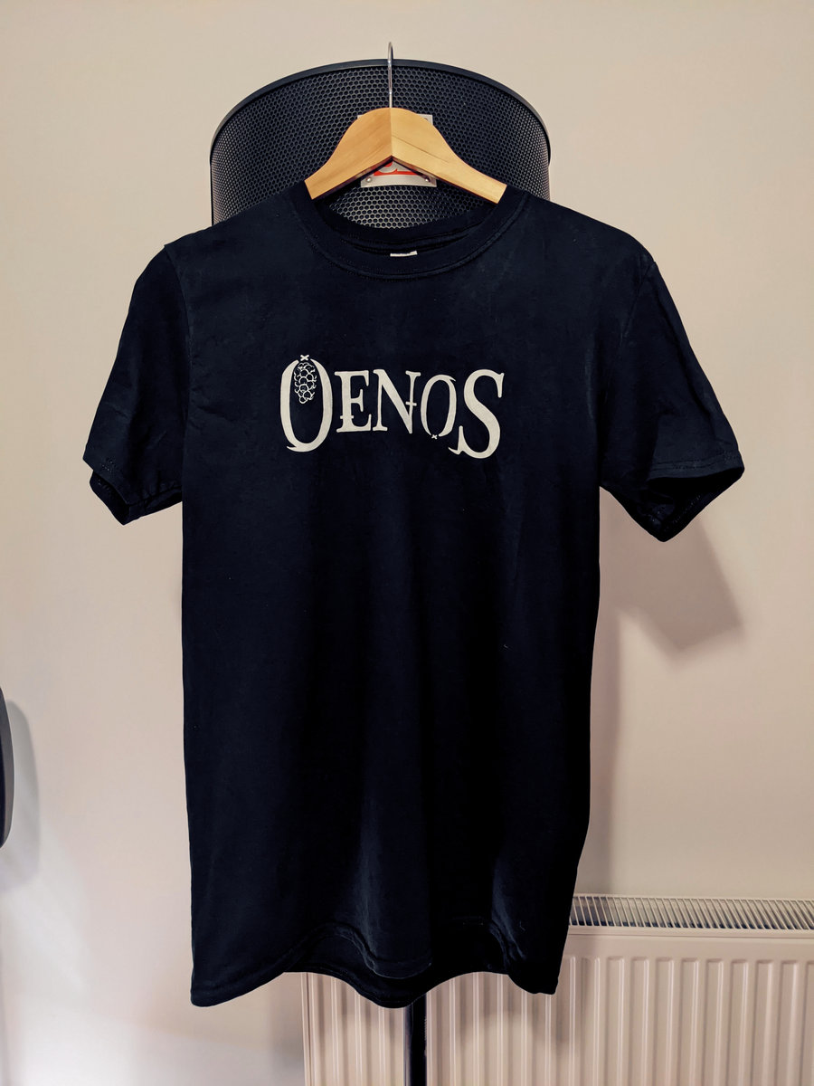Oenos Logo printed on a black Gildan Softstyle T-shirt. Soft, comfy and fits well. Looks great indoors, outdoors and on a human torso.